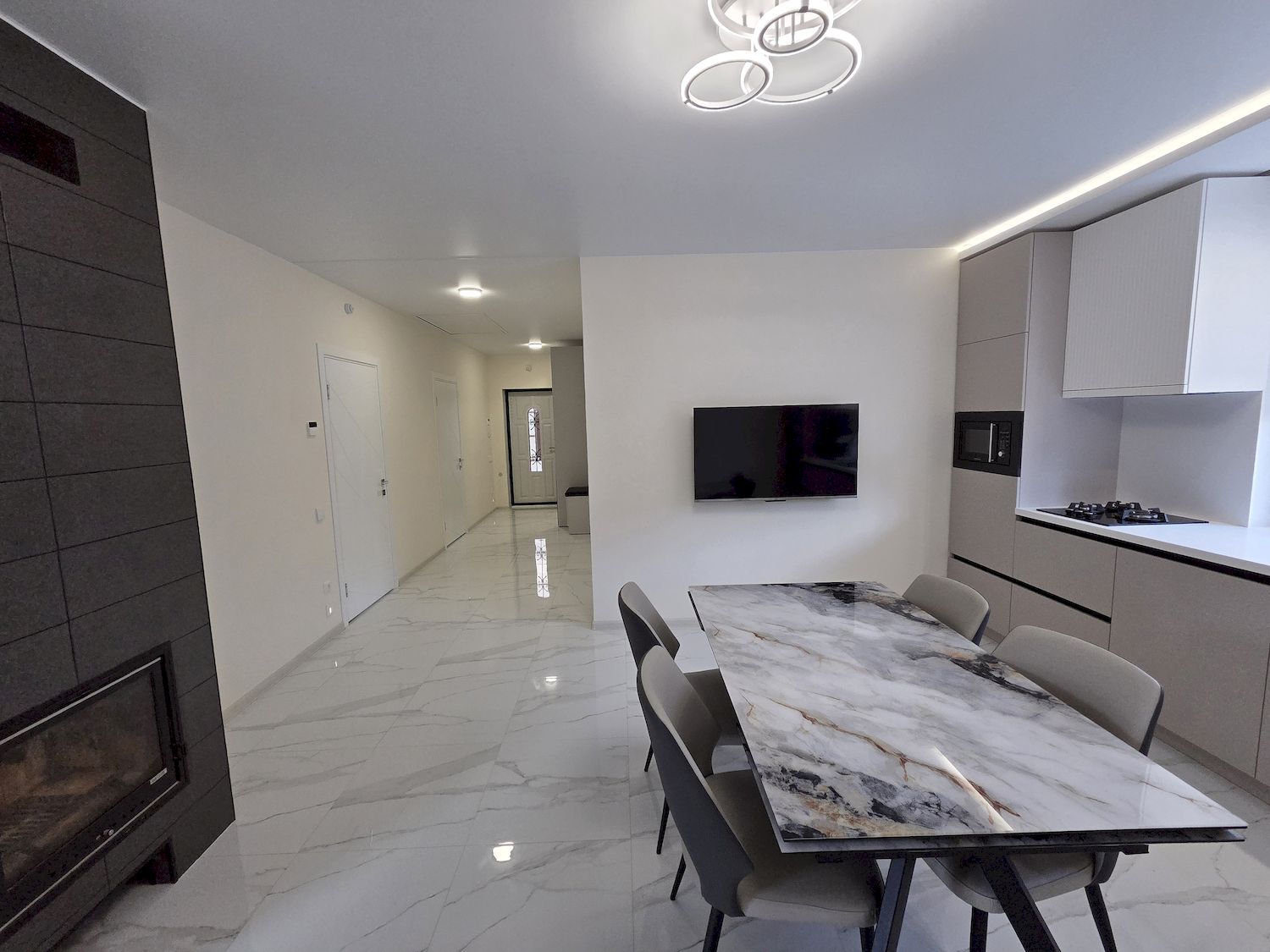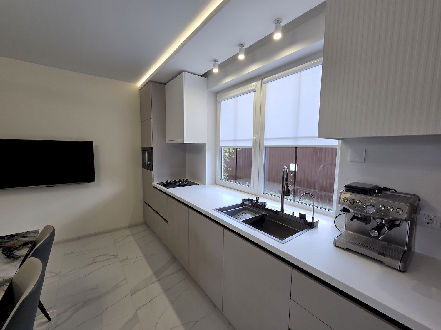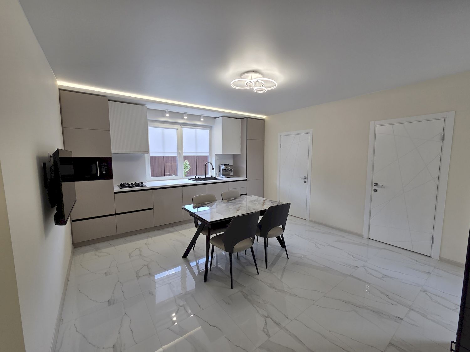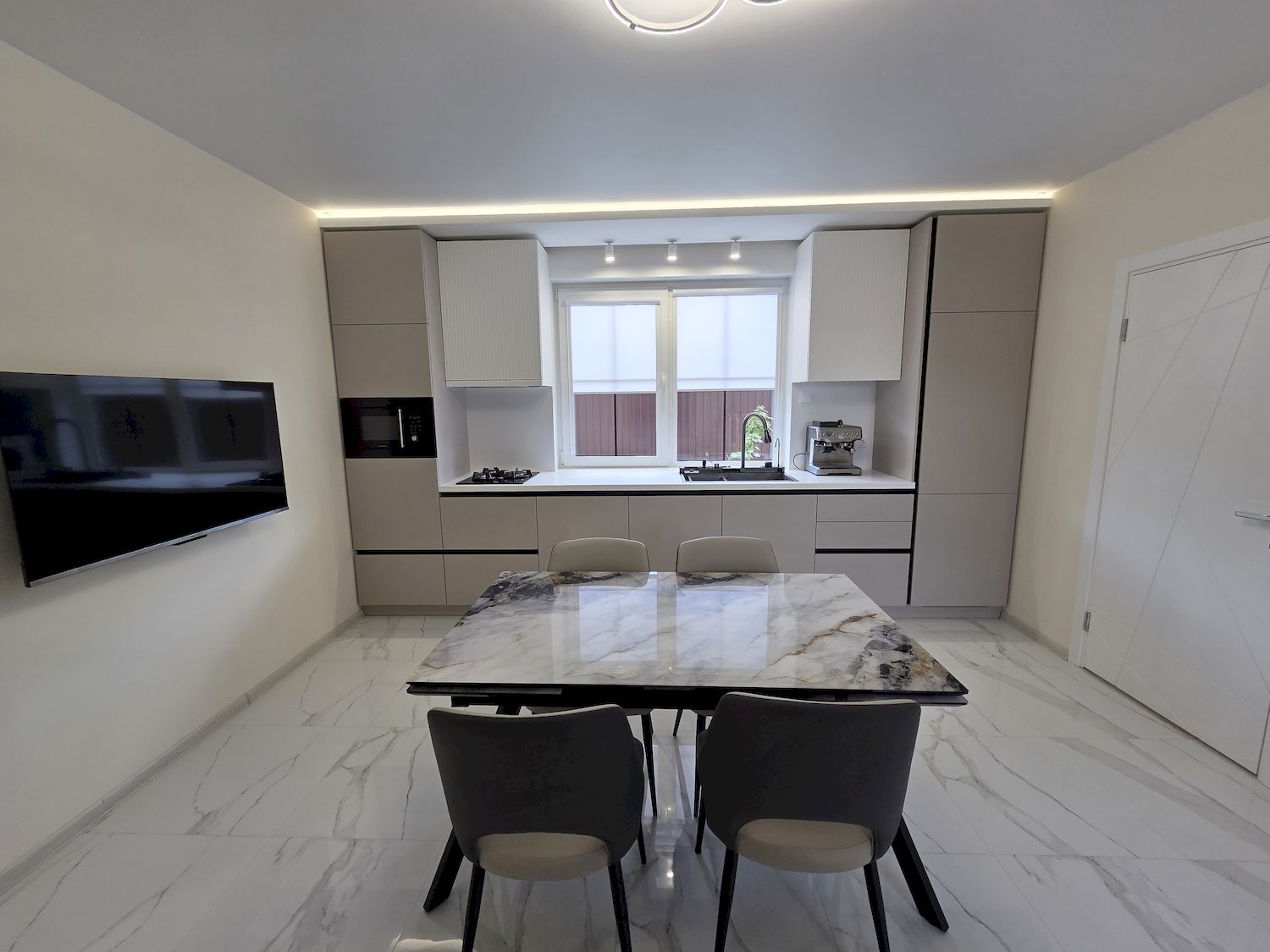 - Очень качественная, дорогая кухонная мебель с подсветкой работающей через умный дом. Столешница - камень.