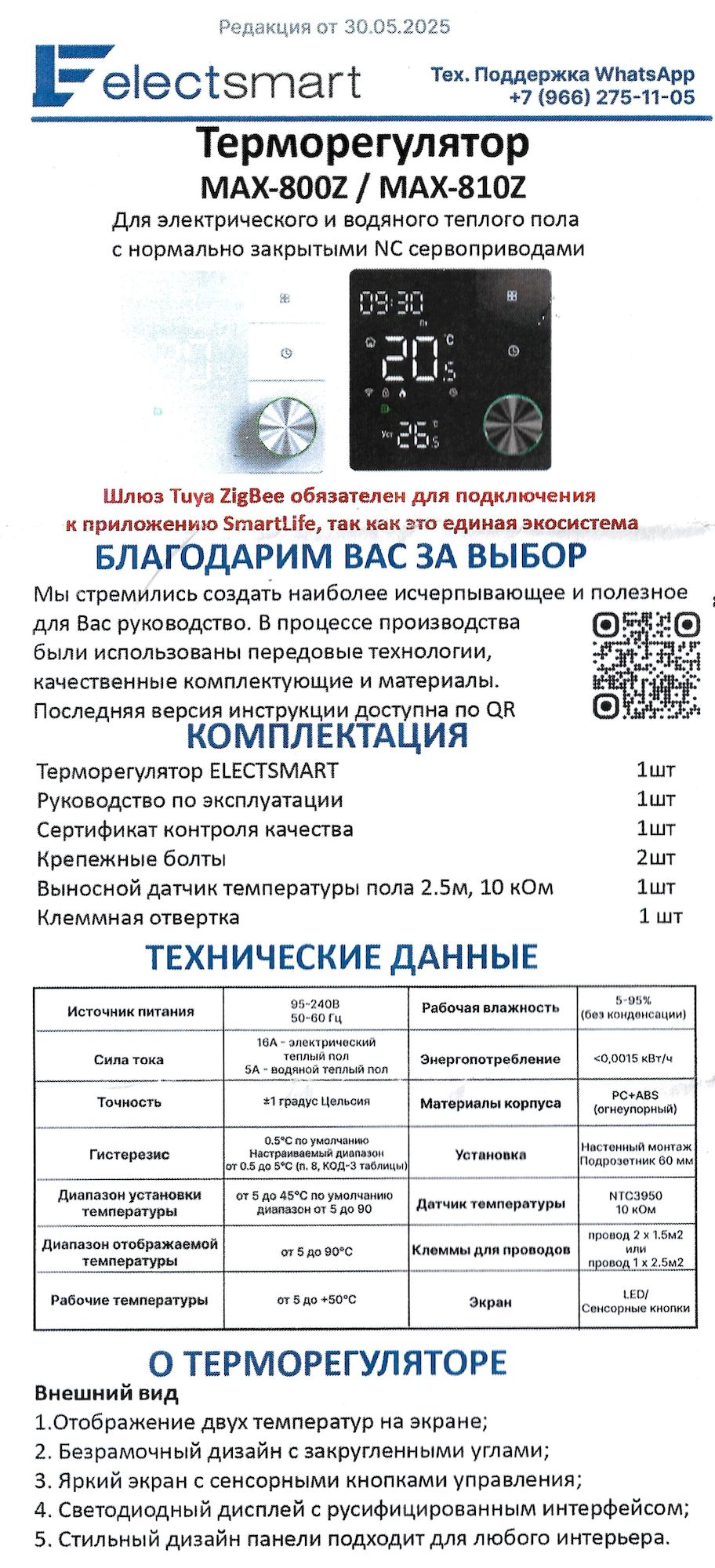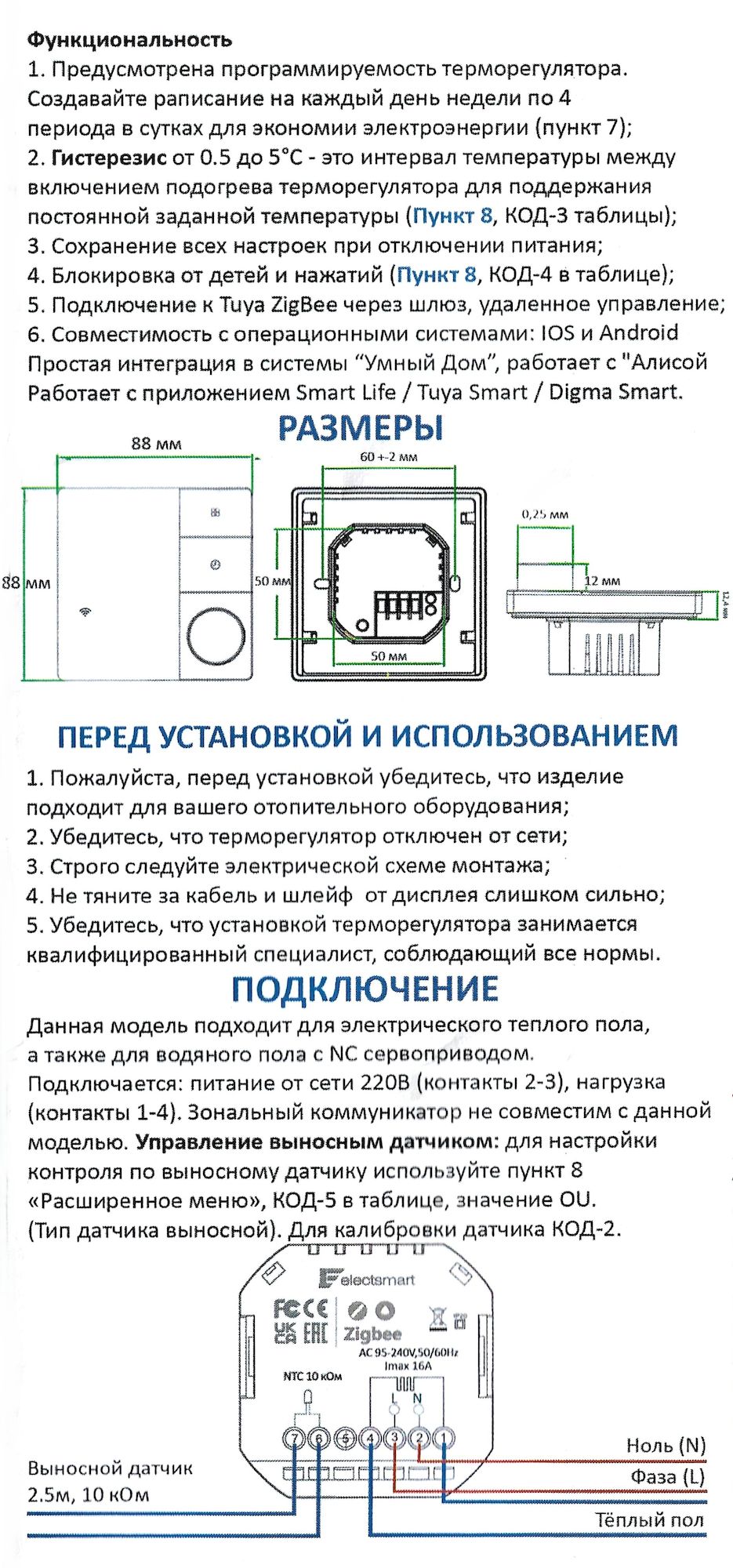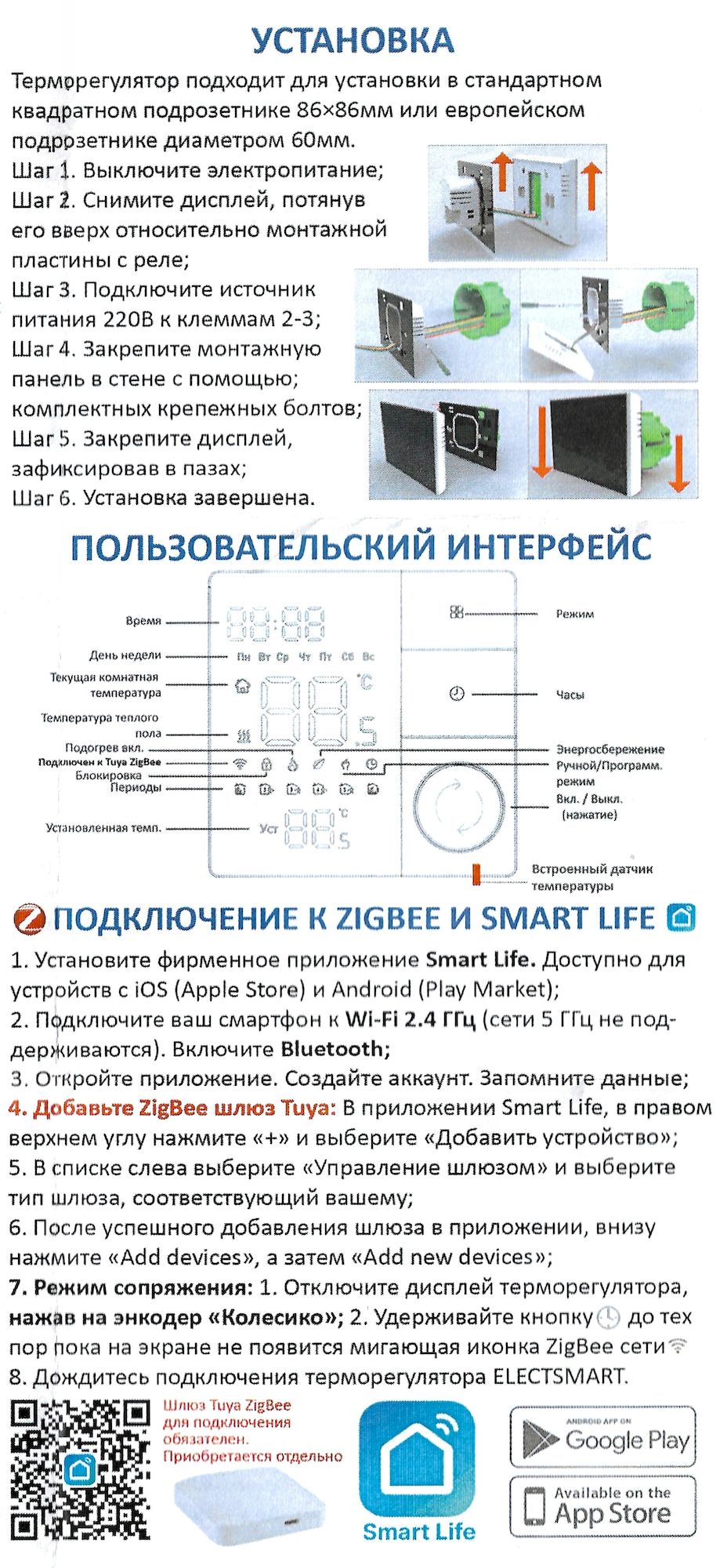 Данный термостат работает по протоколу ZigBee. К приложению для смартфона Smart Life, подключите шлюз (идет в комплекте к дому), зайдите в шлюз / выберите "добавить новое устройство" или значок "+". Перевидите термостат в режим сопряжения: выключите его путем нажатия на колесико, потом нажмите и удерживайте кнопку с часами (над колесиком) до тех пор пока не начнет мигать значок сети, после чего произойдет подключение.